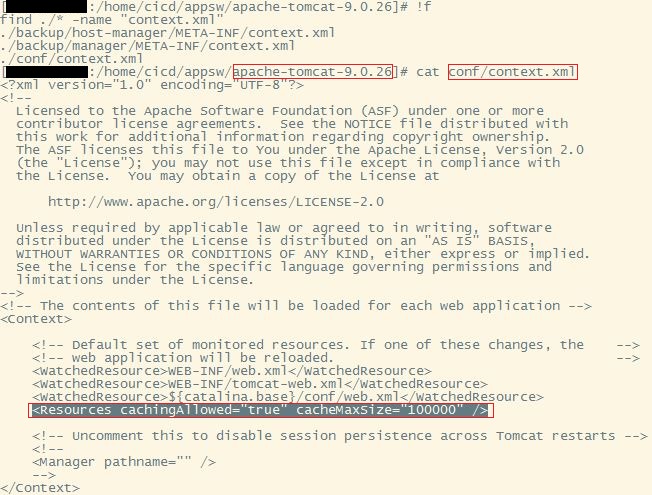 - 해결방안 : apache-tomcat-9.0.26/conf/context.xml 내, cache관련 설정추가