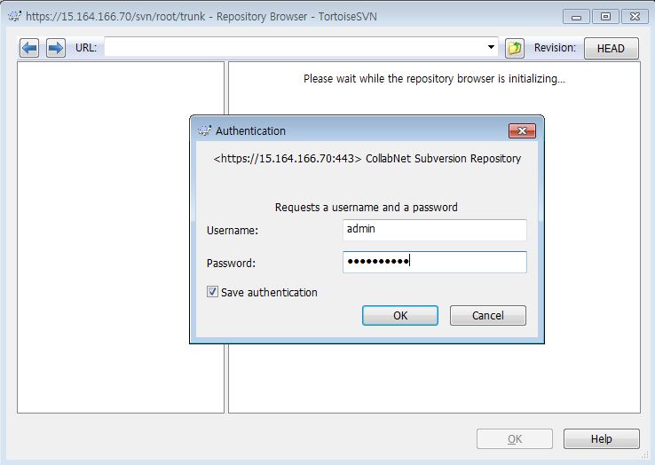 Repository List > 생성 > Name: 설정 > Initialize: Create standard trunk/branches/tags structure