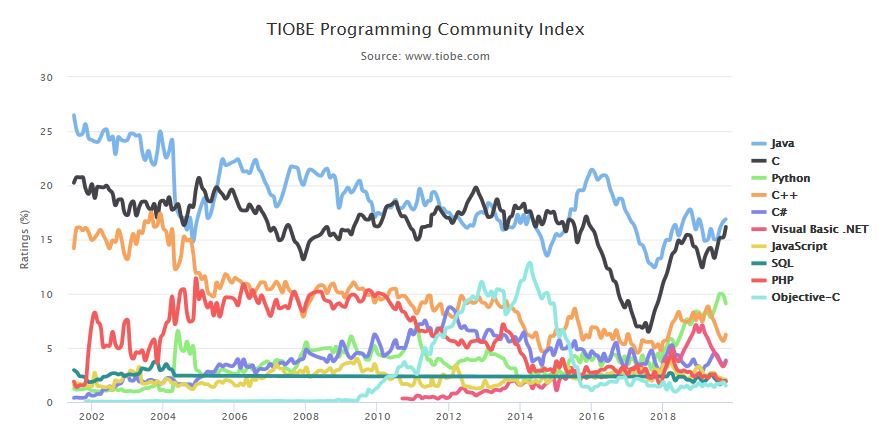 전 세계적으로 java를 사용하고 있지만 현재는 여러 언어에서도 호환성을 지원하고 있기에 사용빈도수가 줄어가는 추세이며, 그래프는 하기 도표를 참고하면 되겠다. (출처 : TIOBE)