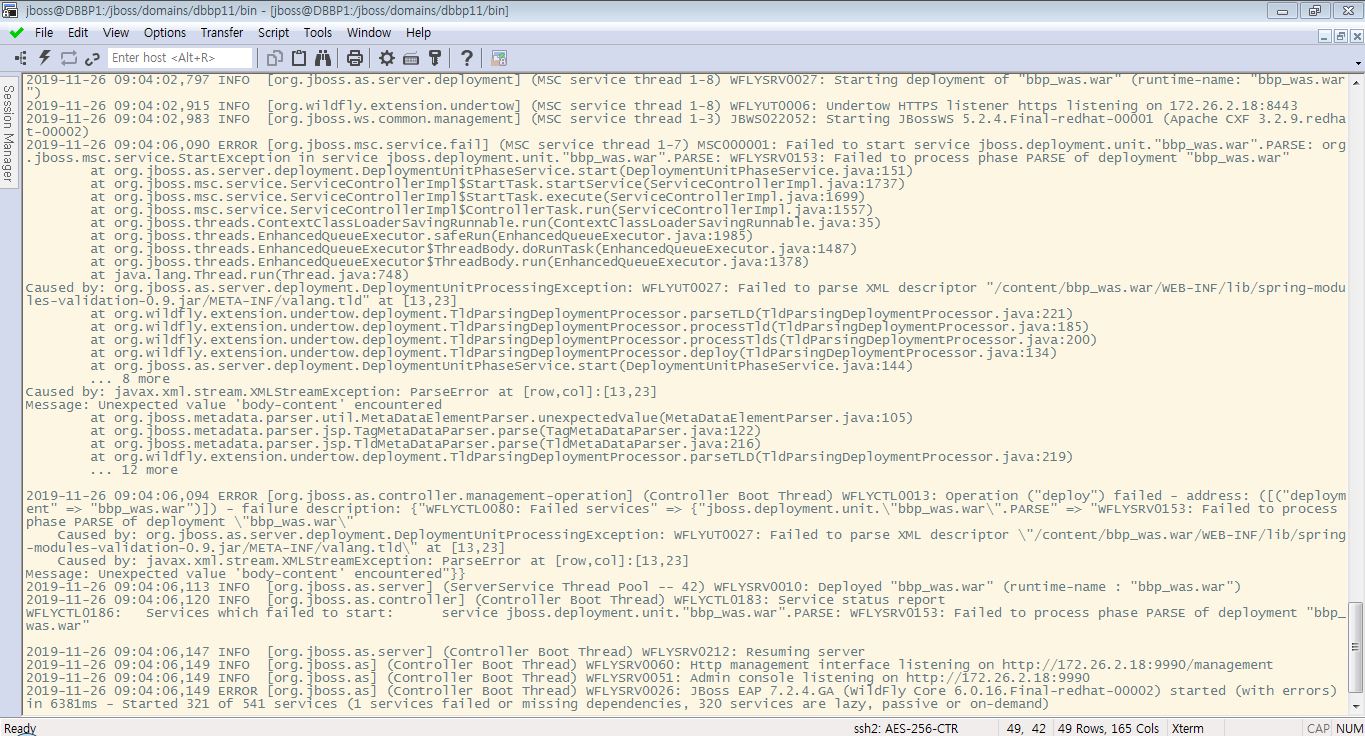 Caused by: org.jboss.as.server.deployment.DeploymentUnitProcessingException: WFLYUT0027: Failed to parse XML descriptor "/content/bbp_was.war/WEB-INF/lib/spring-modules-validation-0.9.jar/META-INF/valang.tld" at [13,23]